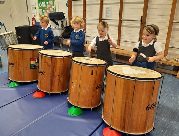 The workshop encourages children to experiment with sound and rhythm, helping them develop their creativity. Working together in small groups promotes collaboration and listening skills, while the structure of the session helps reinforce musical understanding, including timing, tempo, and co-ordination.